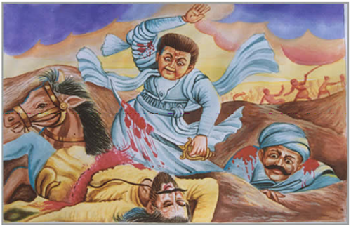 Bhaguji continuously served Maharaj day and night. Once Maharaj was in Ghadhada. At the time some two hundred enemies invaded Dada Khachar's estate with arms with a view to usurping it. Bhaguji with only twelve men challenged them. During the fight the enemy hit Bhaguji so hard that his right shoulder became useless. In return, Bhaguji hit the enemy so hard with his left hand that both his enemy and his horse were cut into pieces. Bhaguji fought well and drove away the enemies. Bhaguji was wounded at different eighteen places in this fight. He was brought on a cot in the village. Maharaj himself attended to Bhaguji and cured him.