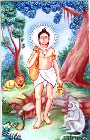 The next morning he got up early. He put around his neck BalMukund’s Batwa, carried with him a volume containing the essence [Summary] of all scriptures, prepared by him, on his left shoulder. In one hand he had a TULSI MALA [a garland of holy basil (ocinum sanction)] and a KAMANDAL (a wooden water pot of an ascetic ) in the other. He put a cotton-string girdle round his waist and a single cloth on the body. On his shoulder he had a deer-skin (Mrig-Charm). In a dress of a celebate [A BRAHMACHARI] he left his home early in the morning and began to proceed in the north towards the Suryu Ganga River.