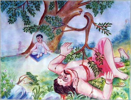 Kalidatta took this opportunity, He created such an illusion that he fell with a mountainous body on the tree under which GHANSHYAM was sitting. That mango tree fell on Ghanshyam. It did fall, but it was not wicked like Kalidatta. The tree fell on Ghanshyam covering him safely like an umbrella. Now Ghanshyam had full protection against the storm and rain. Kalidatta was stunned. He rushed again to grab [ a hold of ] him, when he saw that Ghanshyam was alive. But no sooner did his eyes meet with Ghanshyam’s began to run helter skelter like a possessed man. He was crushed tham he under a tree that was falling in the cyclone and died.