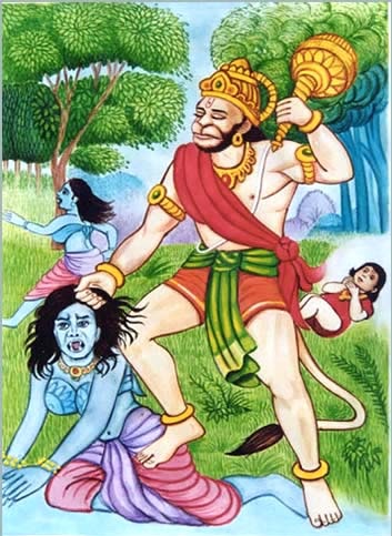 Hanumanji took a leap at that time. He caught hold of Kotara. Kotara gnshing her teeth, was, at that time, about to raise a weapon, the TRISHUL. She was about to strike the child. At that same moment, Hanumanji appeared there with a roar of “Jai Shri Rama.” The weapon -TRISHUL- gave way from Kotara’s hand when she saw Hanumanji. She ran to save her life. Hanumanji gave a sweep of his big tail at those sorceresses running away.